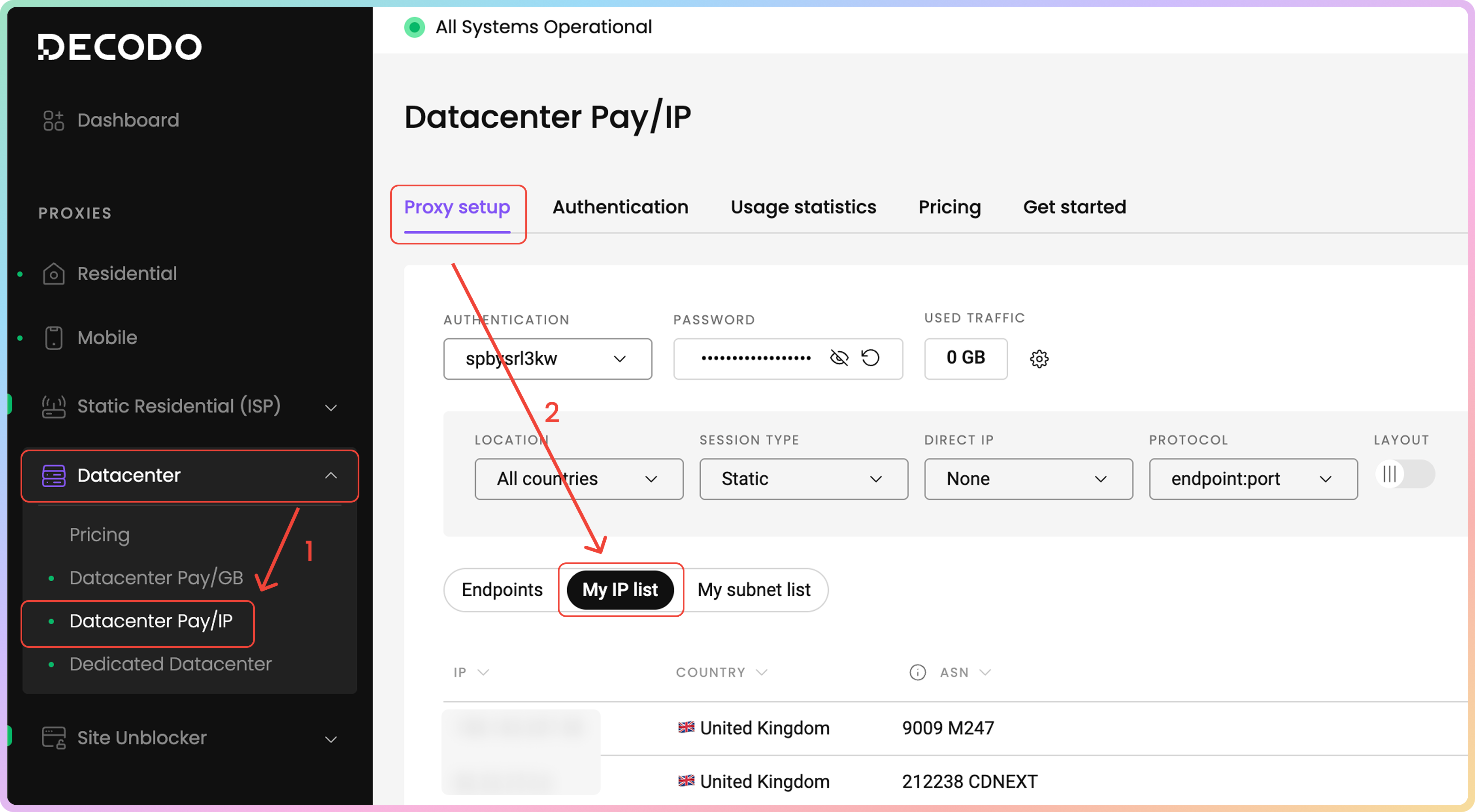 By default, the dashboard shows the proxy endpoints list. That means you would have to navigate to the My IP list section on the dashboard to view your purchased IP list.