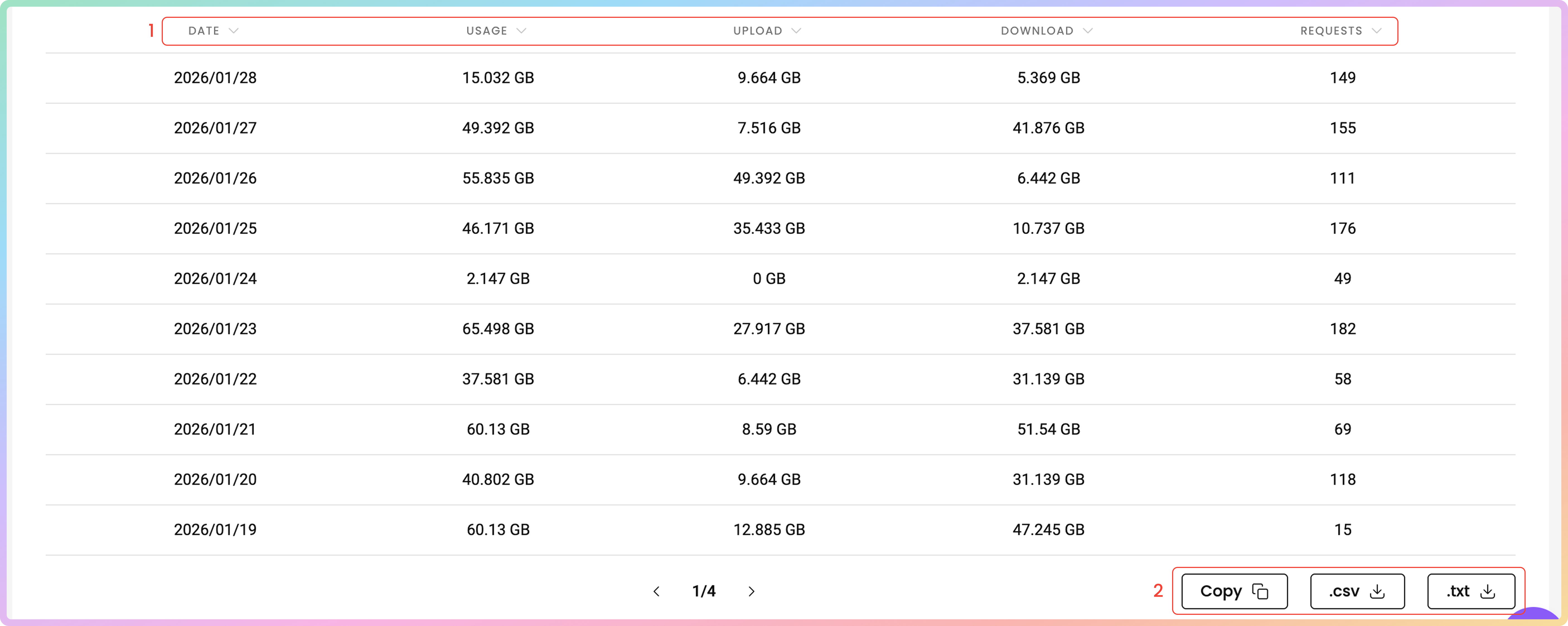 GB, and Requests columns. - You can also copy the data to your clipboard or export it raw in