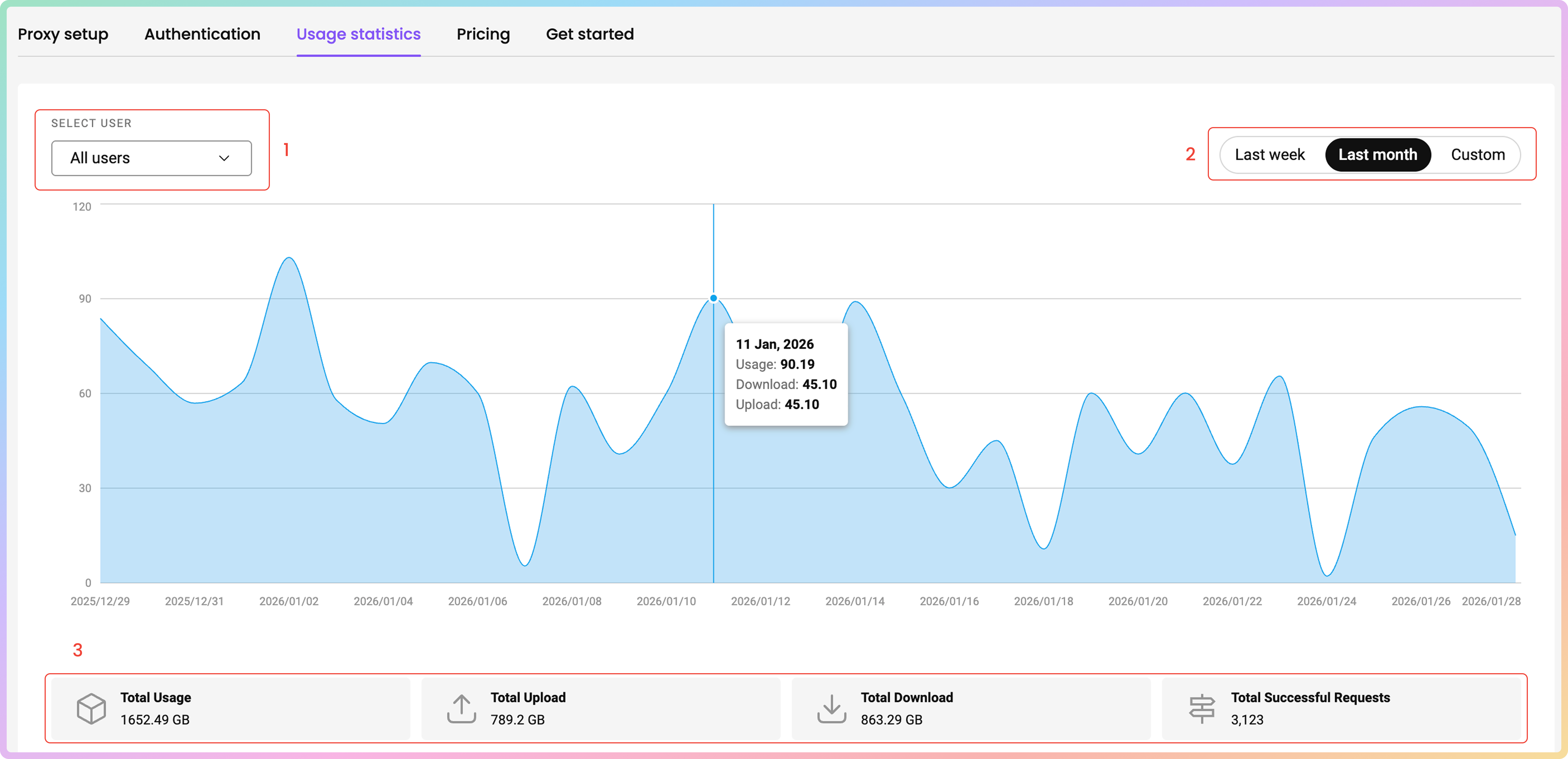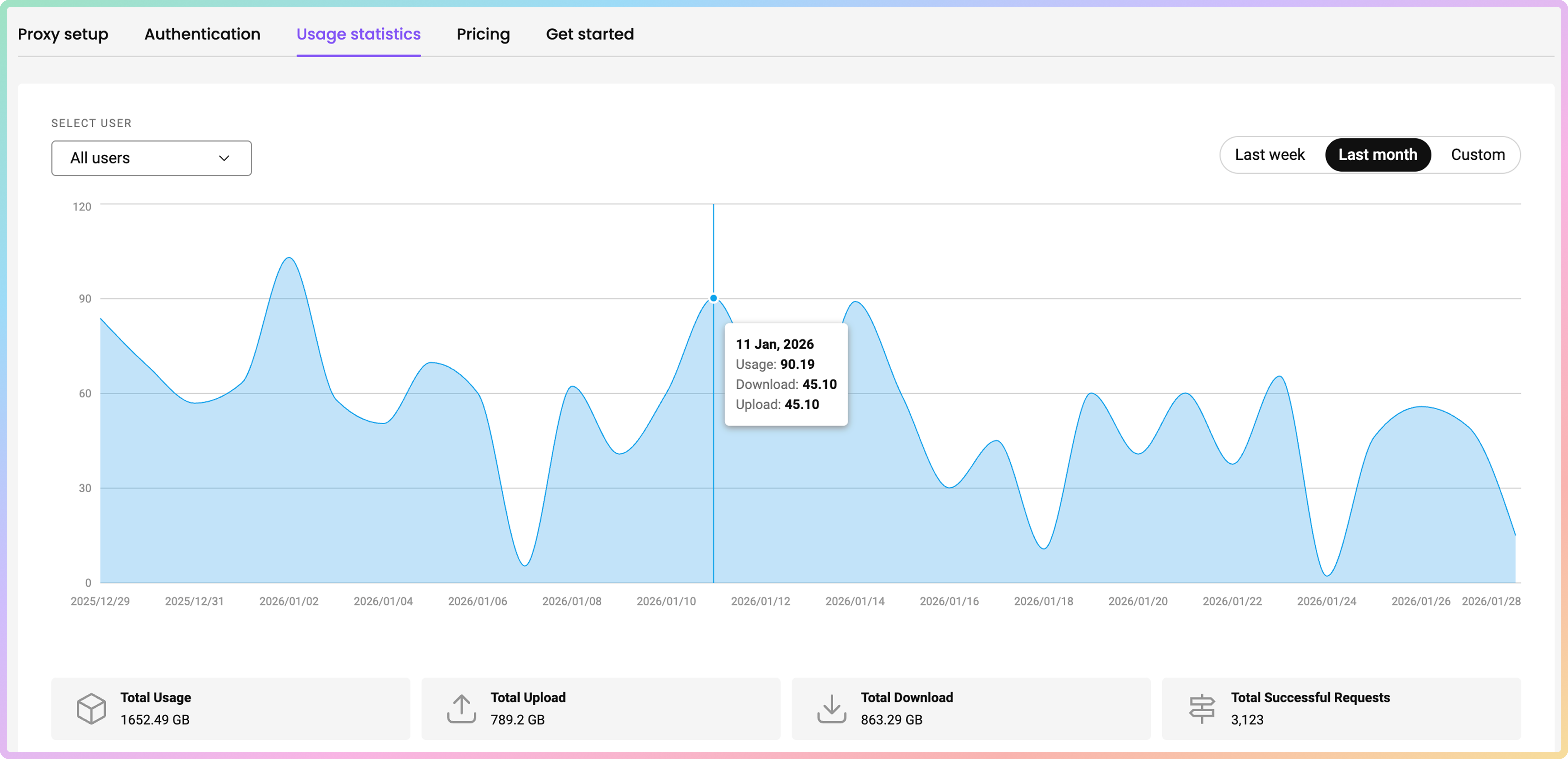 Datacenter Pay/IP proxy traffic usage details can be found on your dashboard statistics page. Simply navigate to the Datacenter Pay/IP proxy page via the dashboard left panel and click on the Usage statistics section.