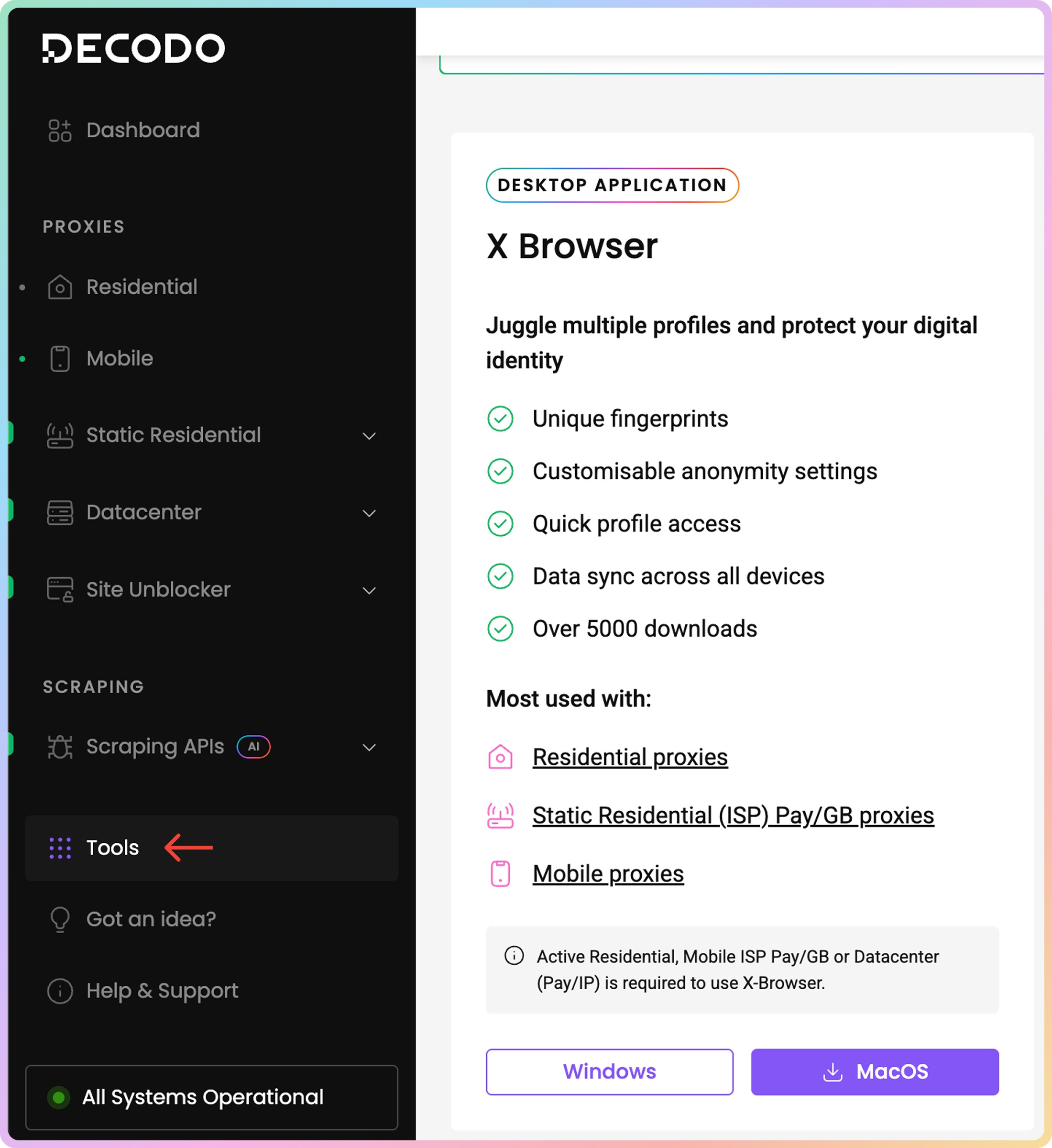 To download X Browser navigate your dashboard through Tools→X Browser→Learn more, and then choose either Windows or macOS.