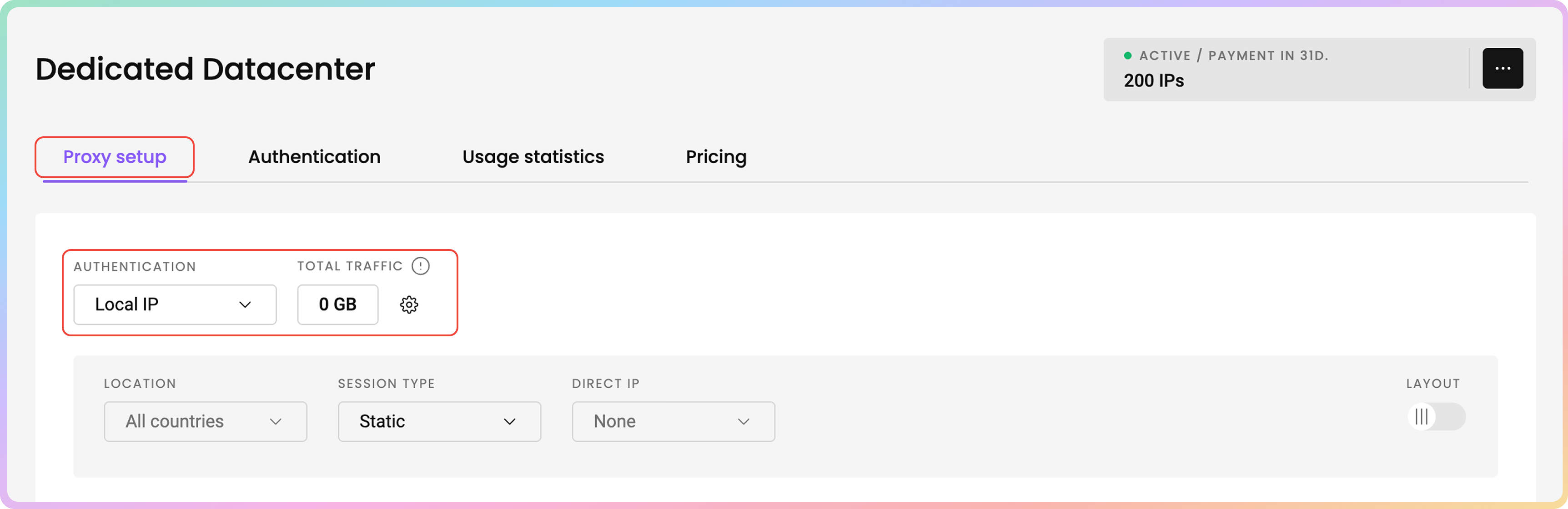 We support Dedicated Datacenter proxy authentication via username and password or IP-based whitelisting.