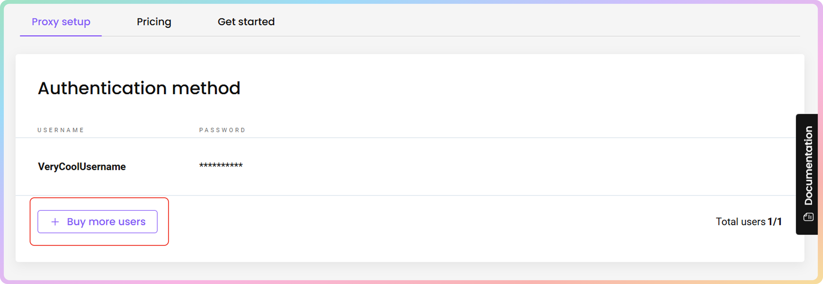 - After you purchase a subscription, a proxy username and password will be automatically generated in the Authentication section.