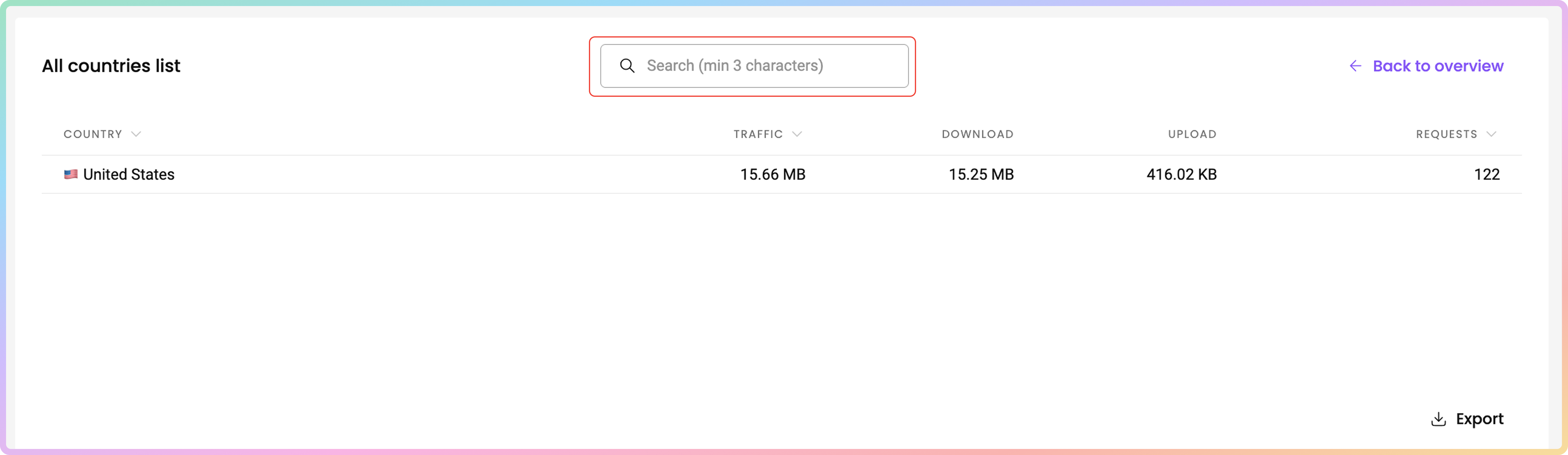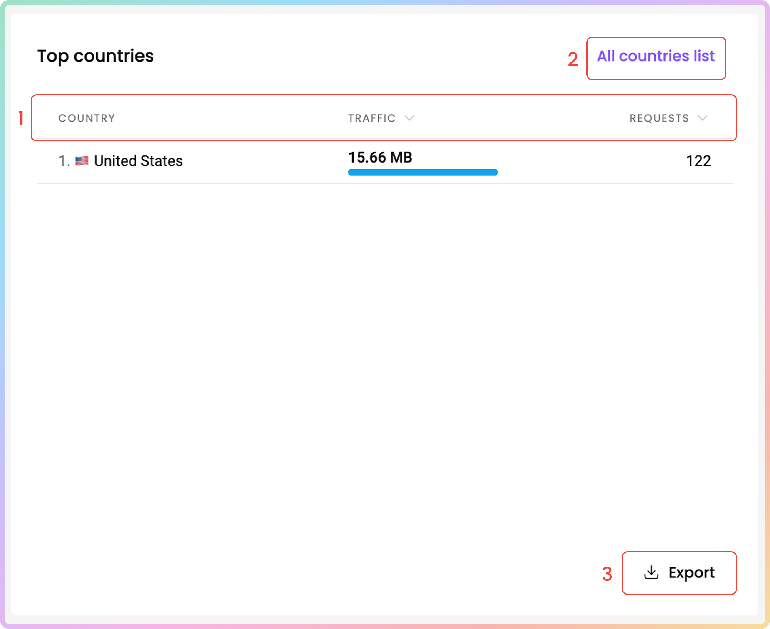 In the Top countries table, you can see the countries you have targeted with the proxies, sorted by total traffic consumption in descending order.
