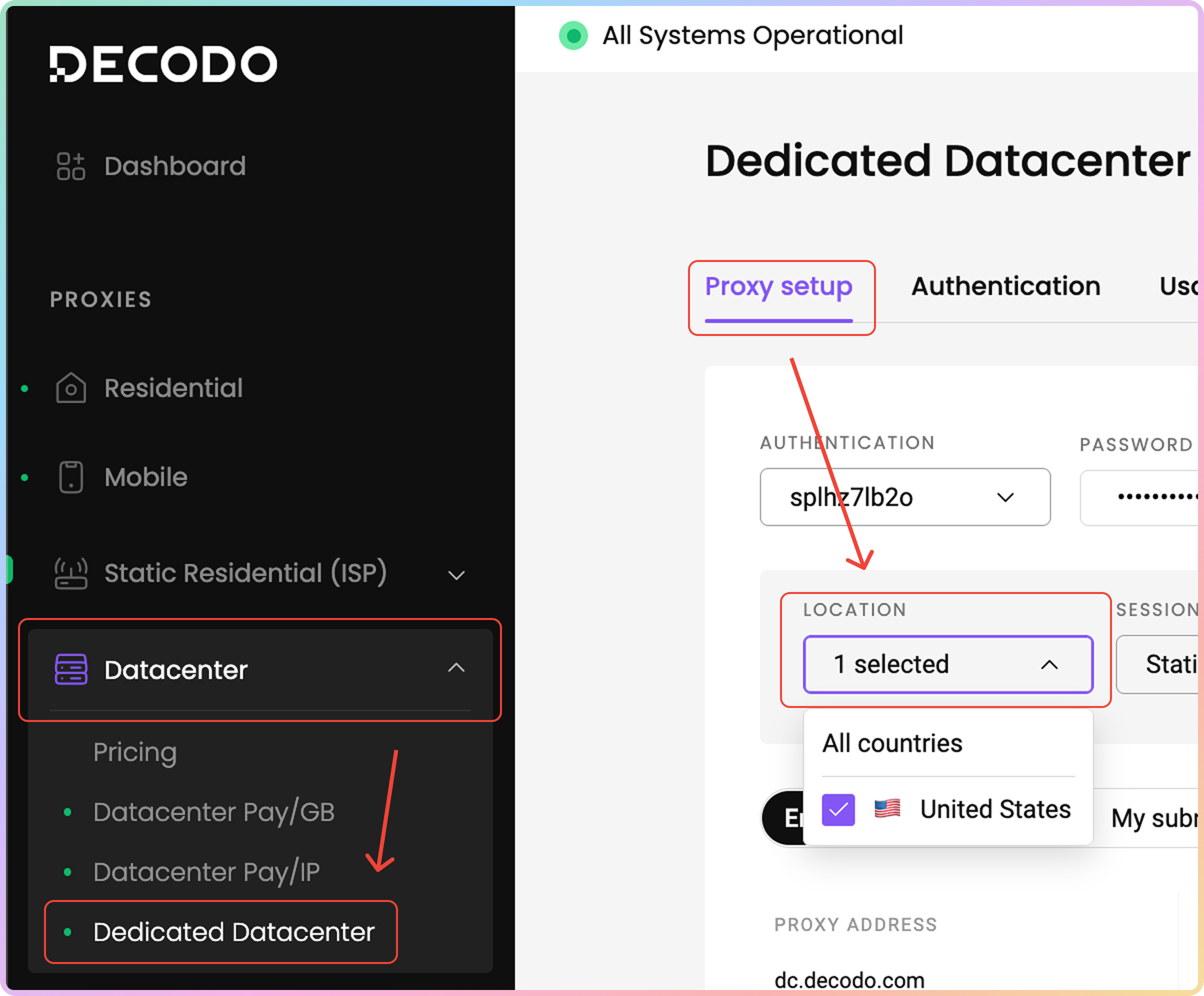 When using backconnect, the endpoint proxy server remains the same: dc.decodo.com