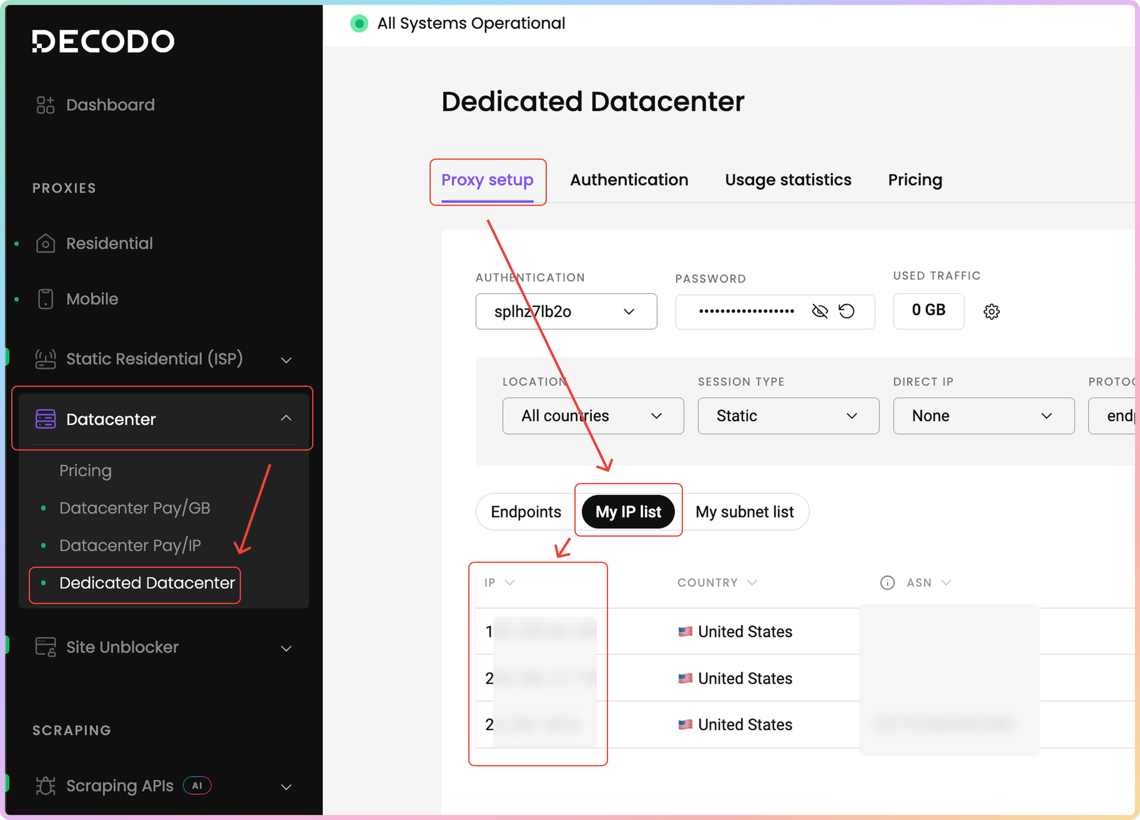It's possible to target specific IP addresses from the proxy IP list you've purchased. To find your proxy IPs, navigate to the Datacenter → Dedicated Datacenter → Proxy setup dashboard page. Then, click on the My IP list tab. In the table below, you will find the IP addresses you've purchased, their country of origin, and the ASN.