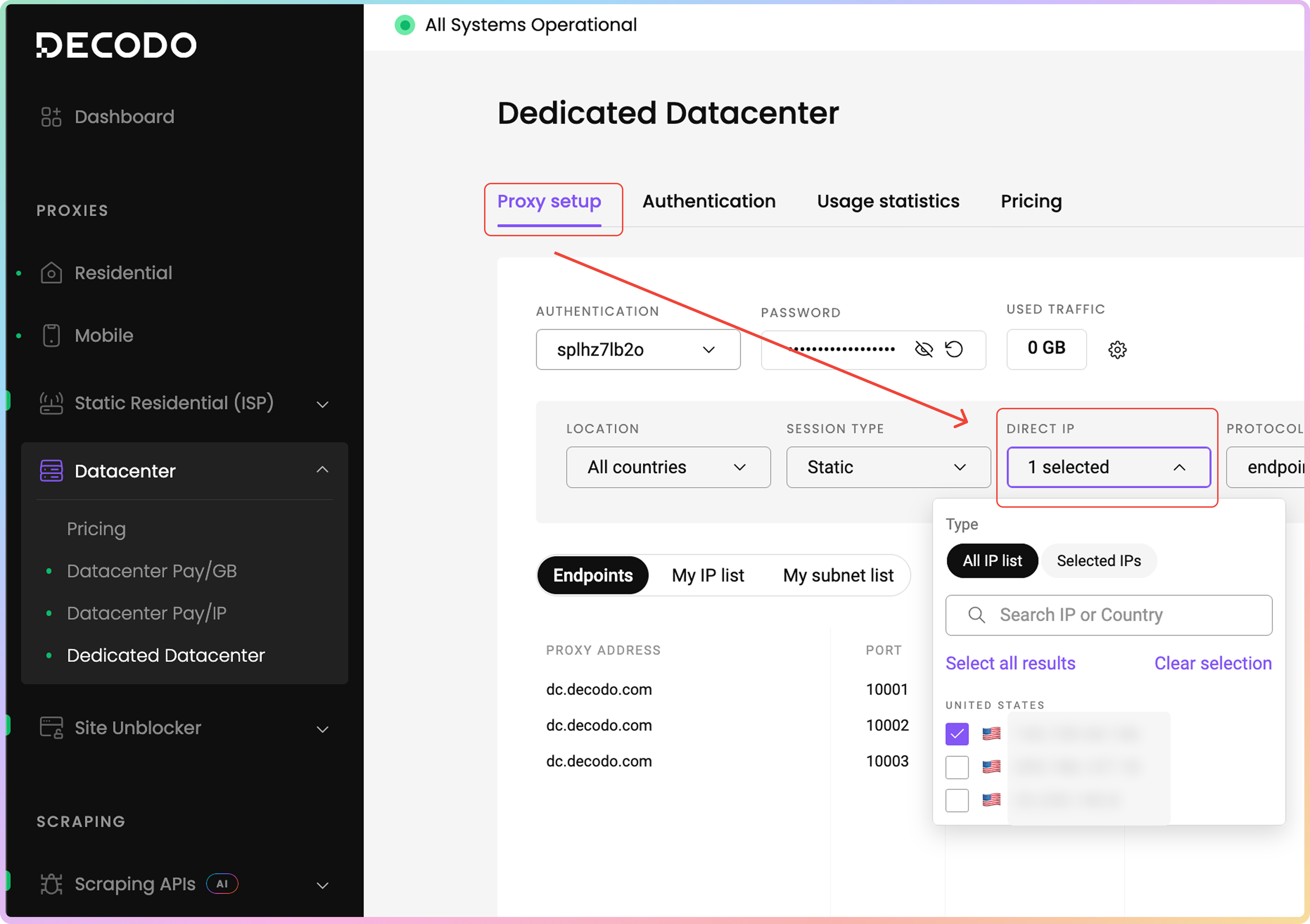 If you wish to generate an endpoint list, which you can then export, or a request example with a specific IP address, in the same Proxy setup page, click on the Direct IP field and in the dropdown menu, and check your preferred proxy IP address. There, you can select all IPs or use the search bar to find a specific IP.