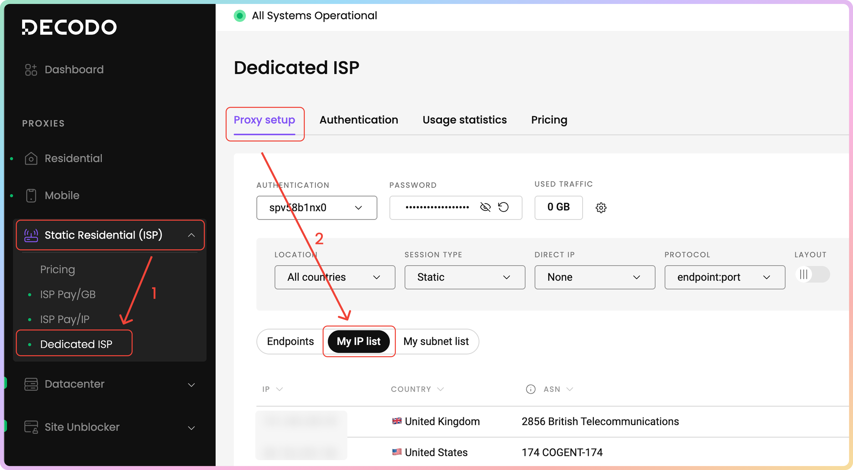 By default, the dashboard shows the proxy endpoints list. That means you would have to navigate to the My IP list section on the dashboard to view your purchased IP list.