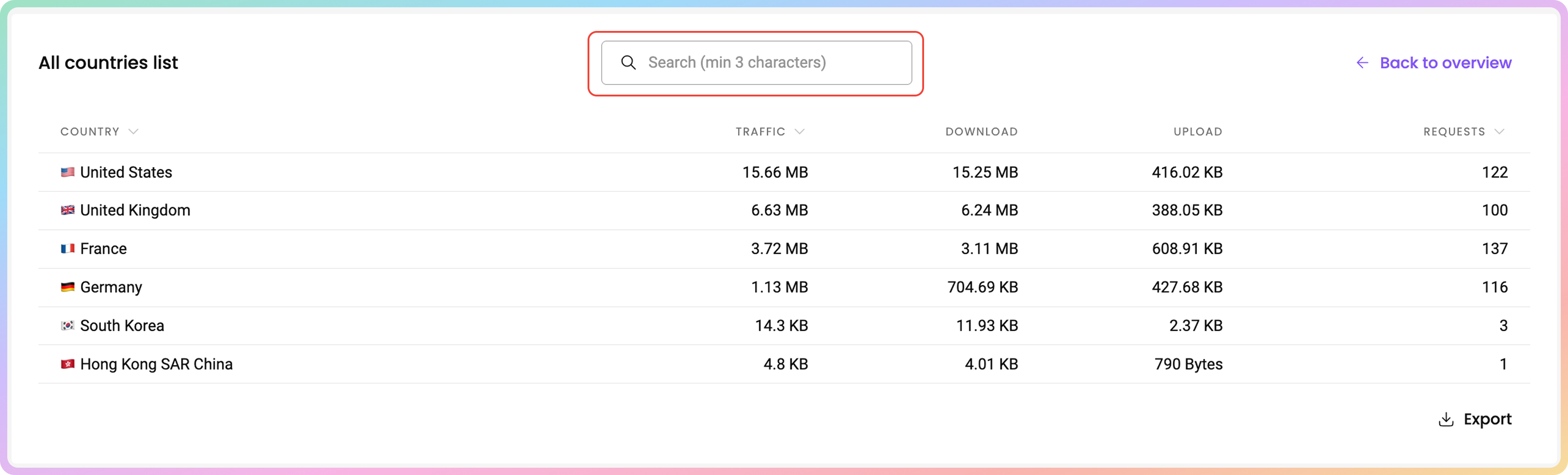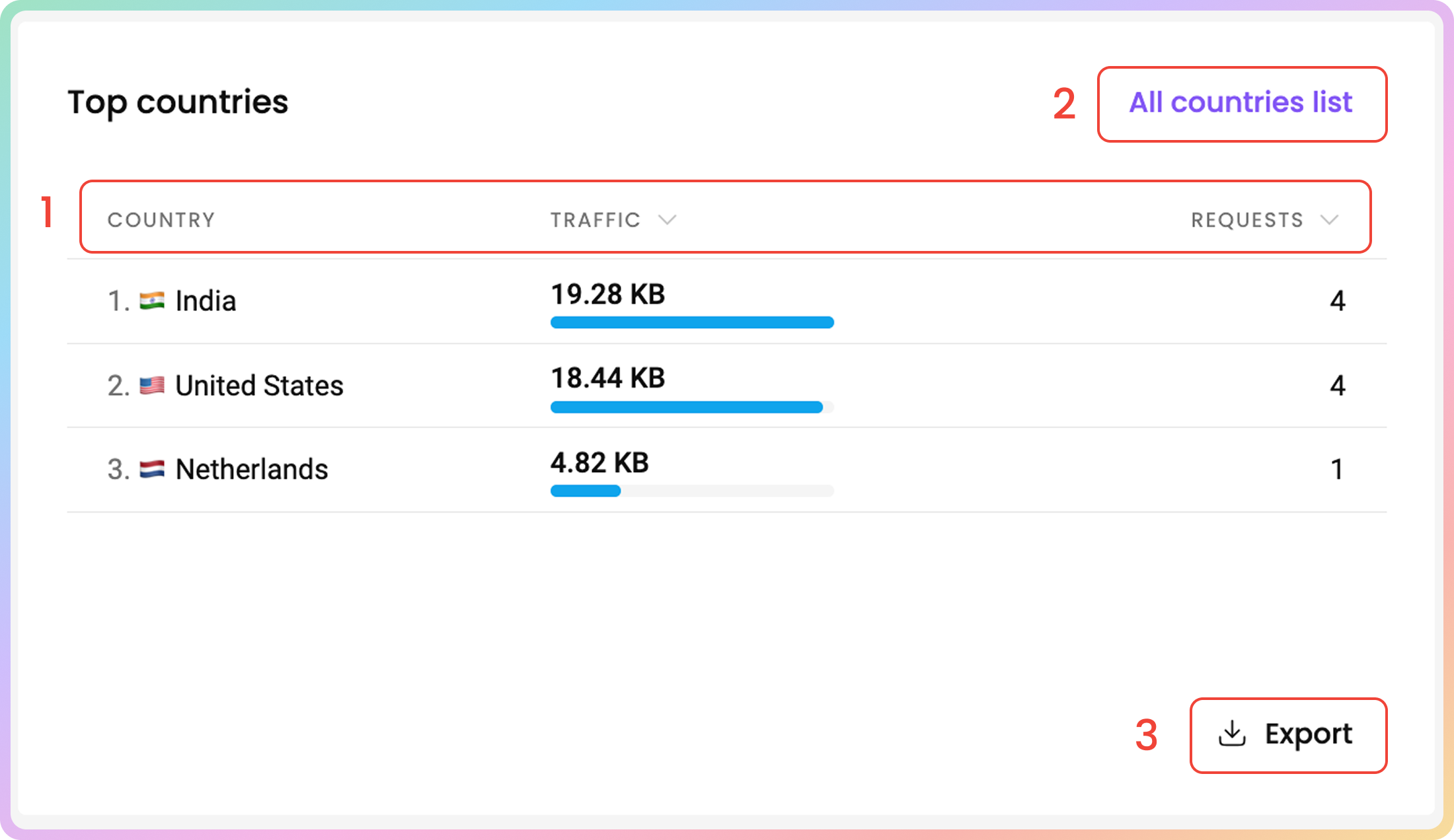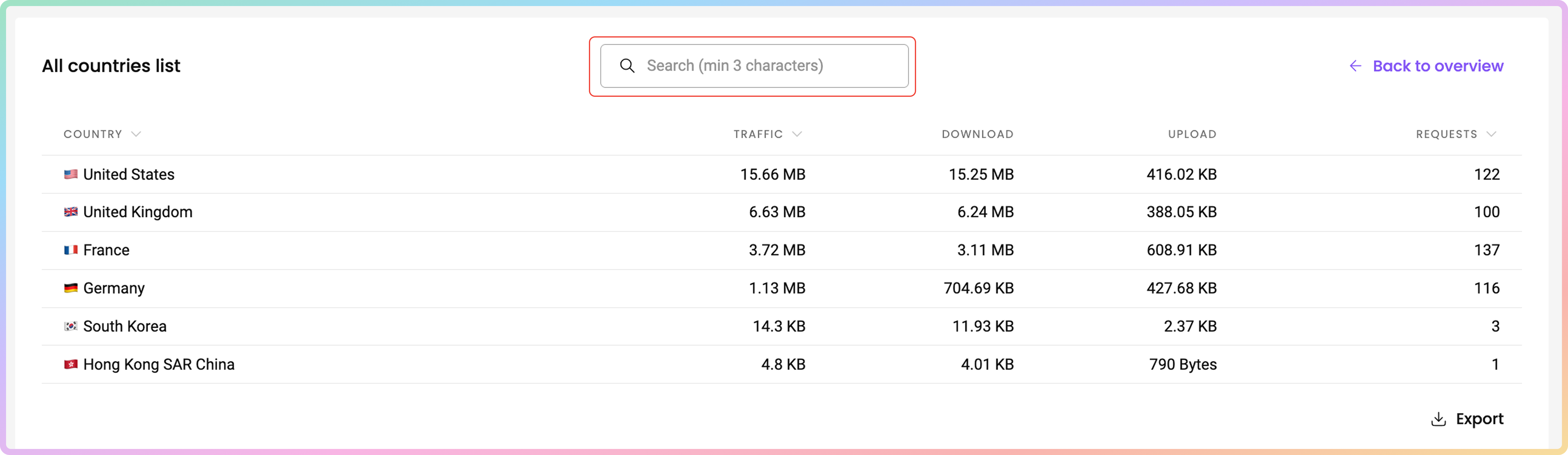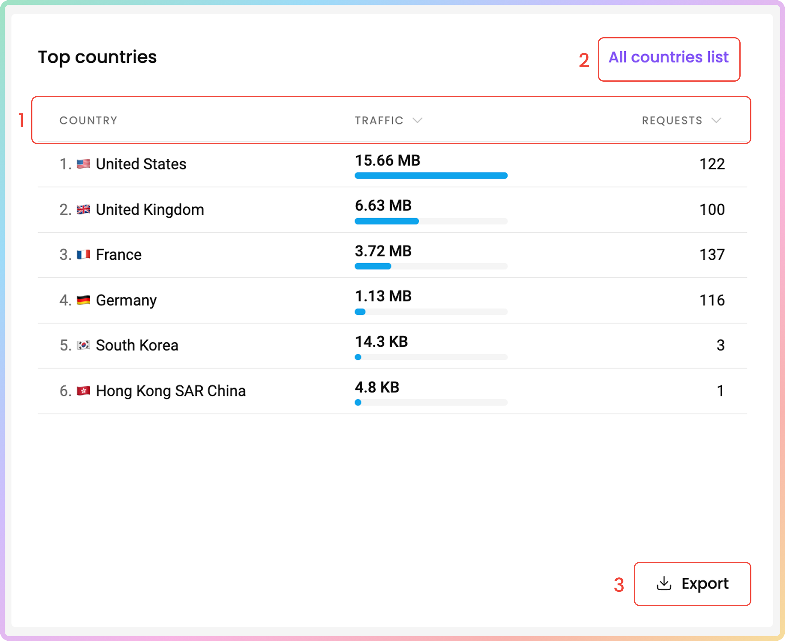 In the Top countries table, you can see the countries you have targeted with the proxies, sorted by total traffic consumption in descending order.