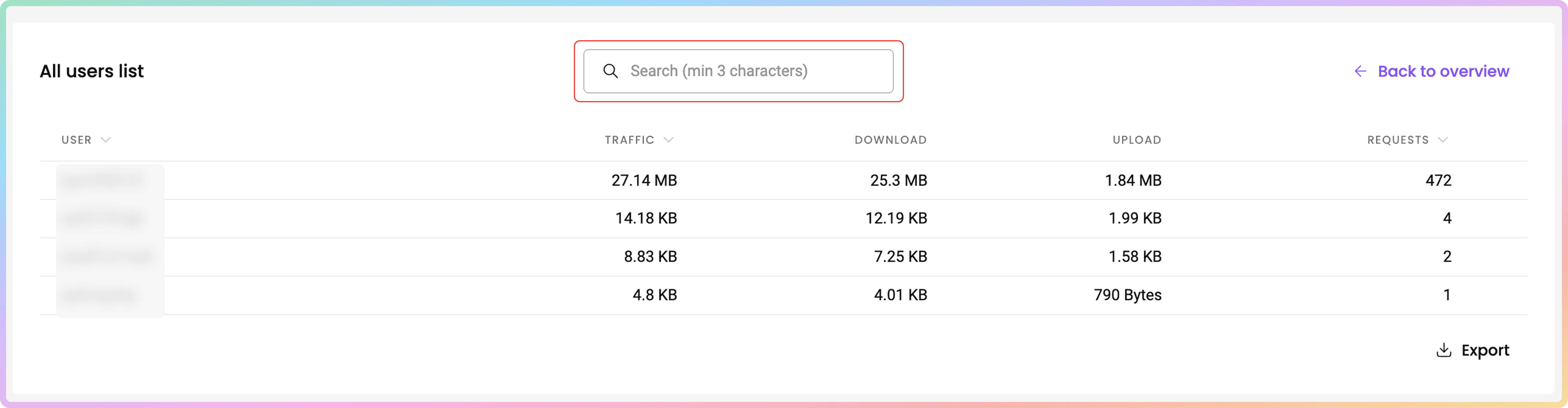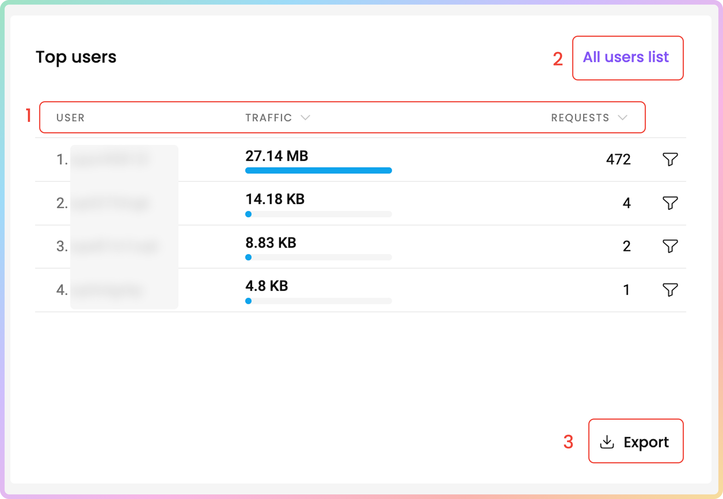In the Top users table, you can see the used traffic of your proxy users and whitelisted IPs, sorted from highest to lowest.