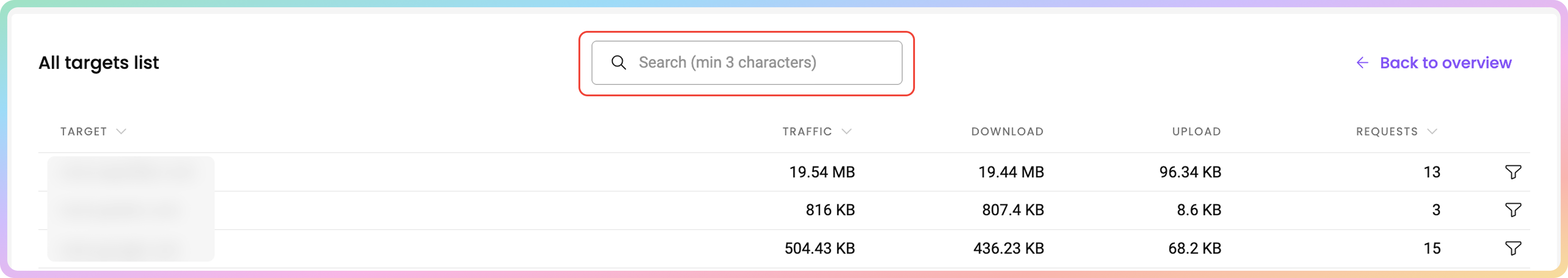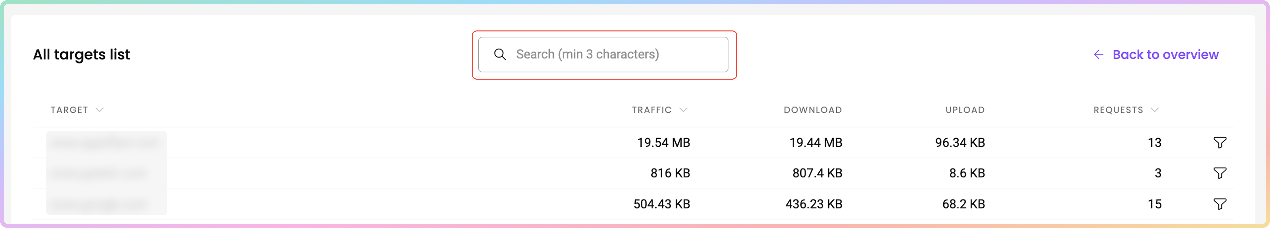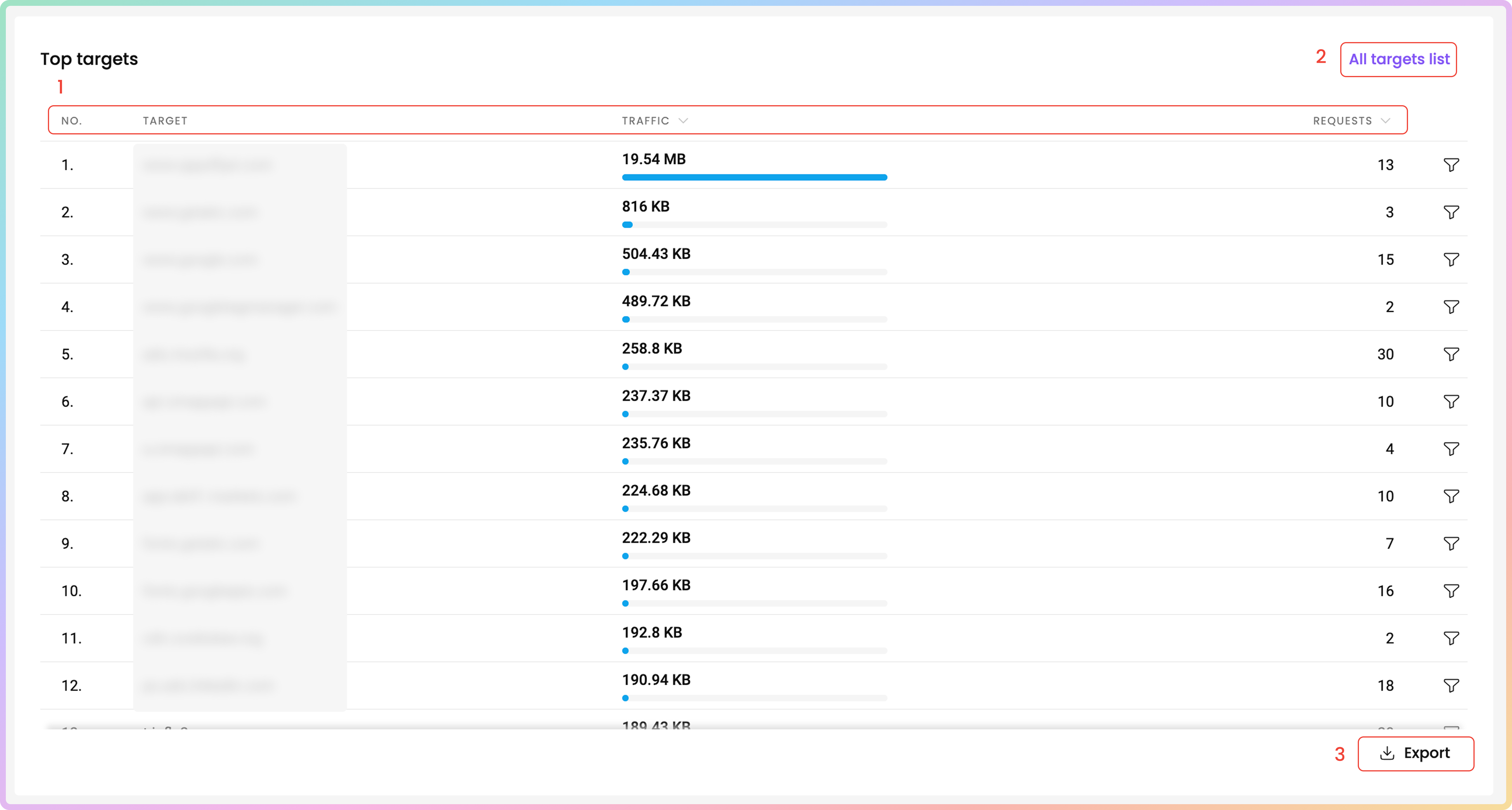 In the Top targets table, you can see the target domains, which you have accessed with the proxies, sorted by total traffic consumption in descending order.