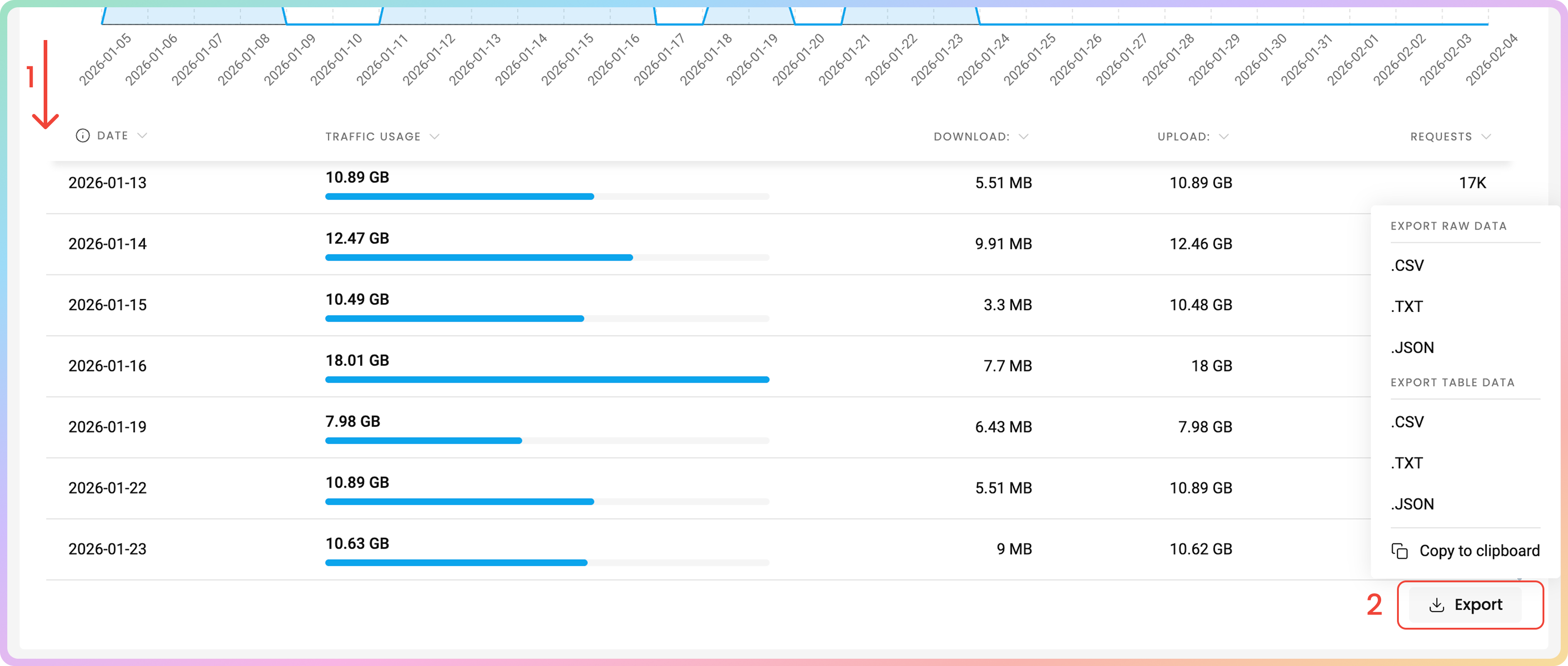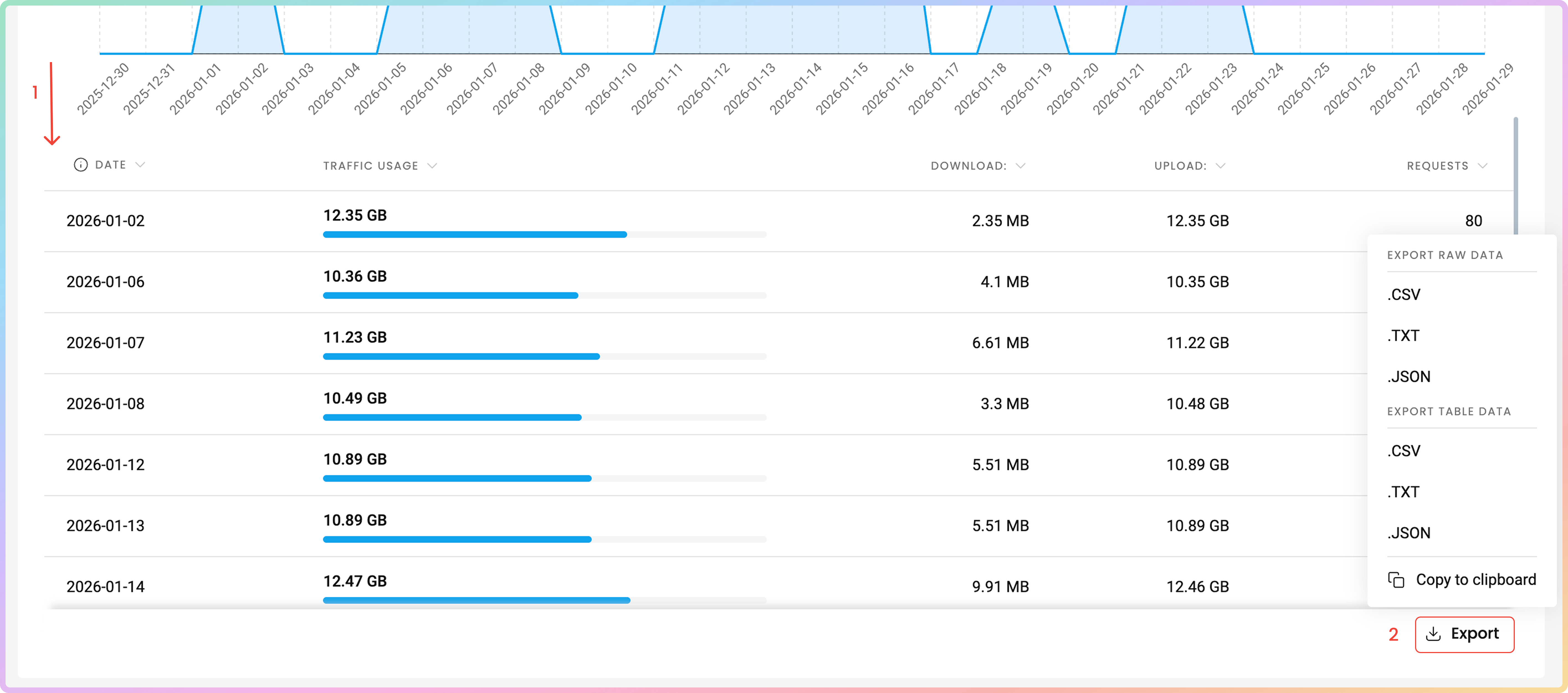 MBorGB, and Requests. - You can export the table's data directly or export the raw data in the following file formats: