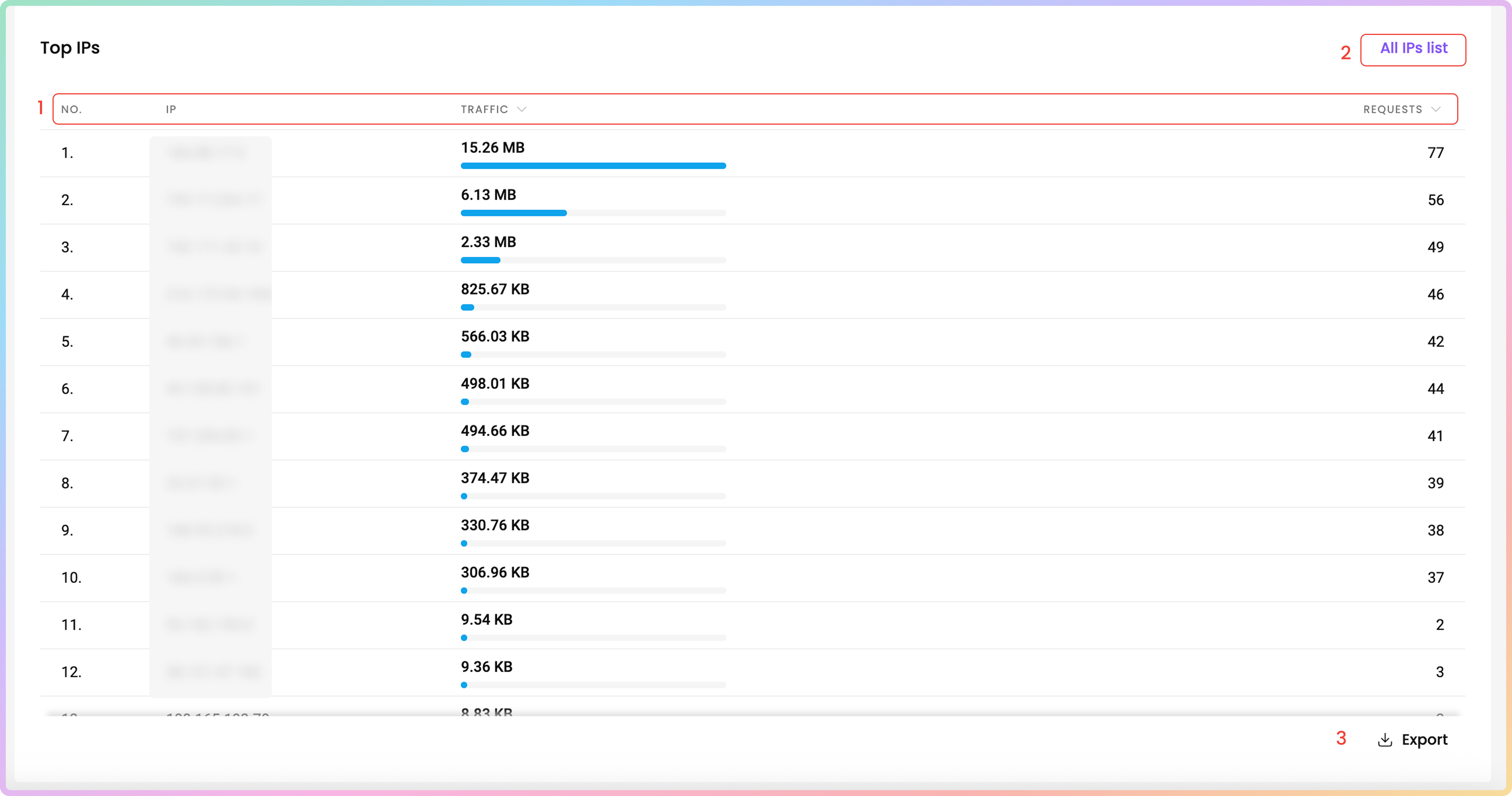 In the Top IPs table, you can see the proxy IPs you have targeted, sorted by total traffic consumption in descending order.