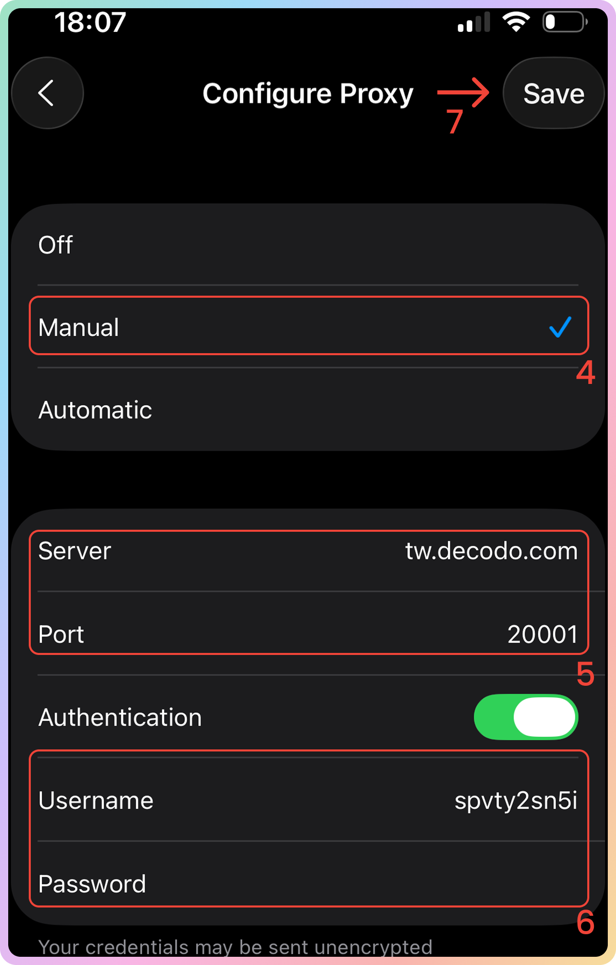 To disable the proxy, just tap Off in the Configure Proxy section and then tap Save again.