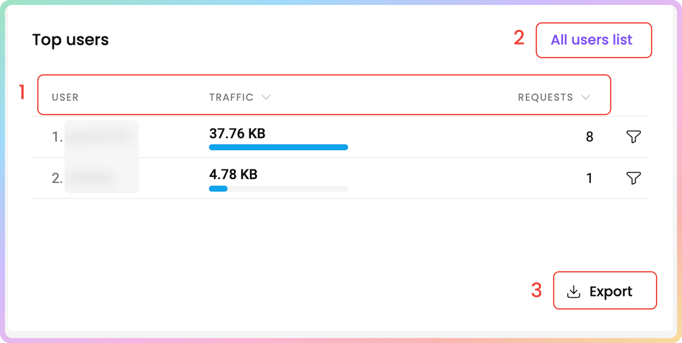 In the Top users table, you can see the used traffic of your proxy users and whitelisted IPs, sorted from highest to lowest.
