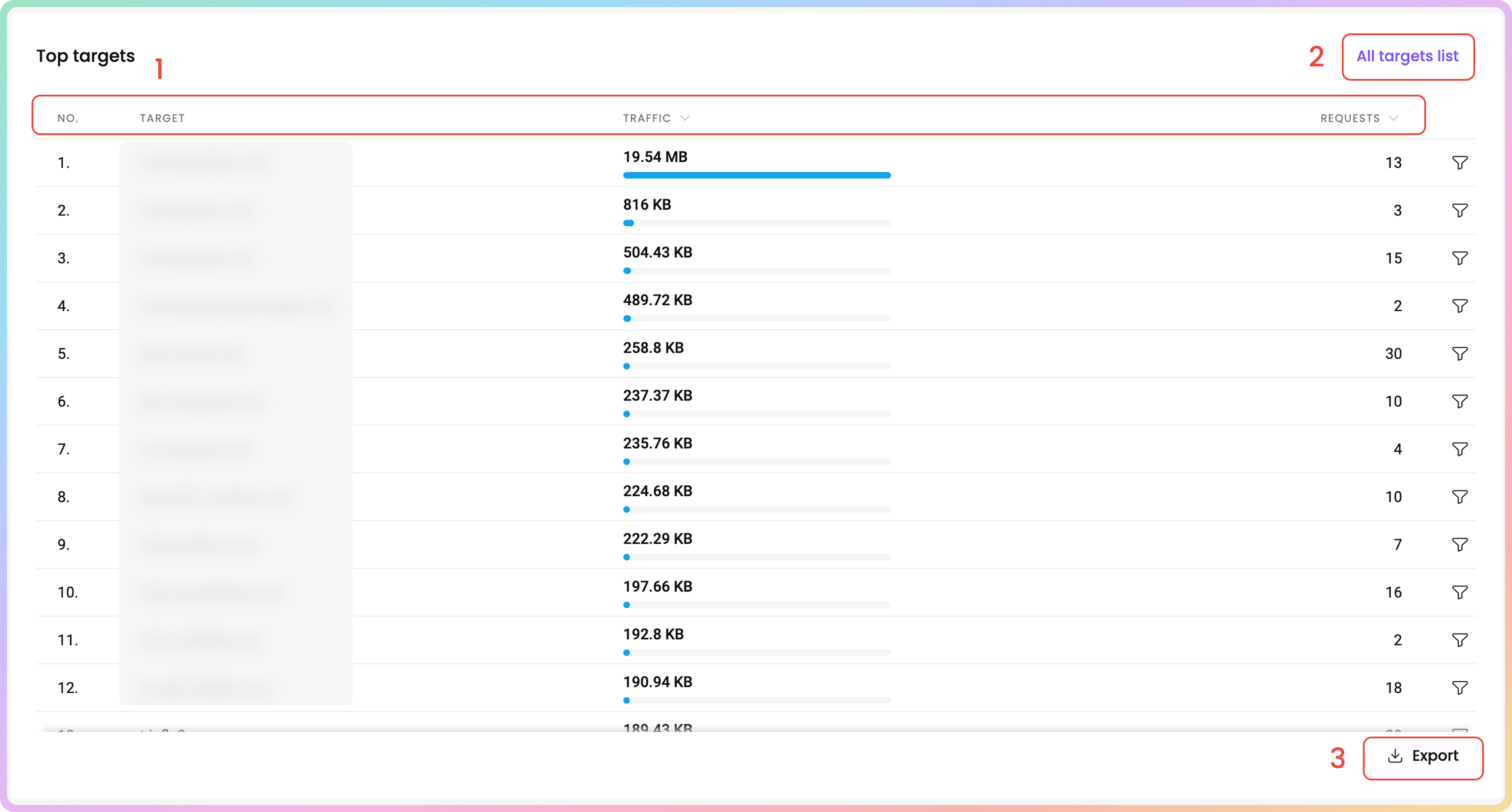 You can find the No., Target, Traffic, and Requests columns as well.