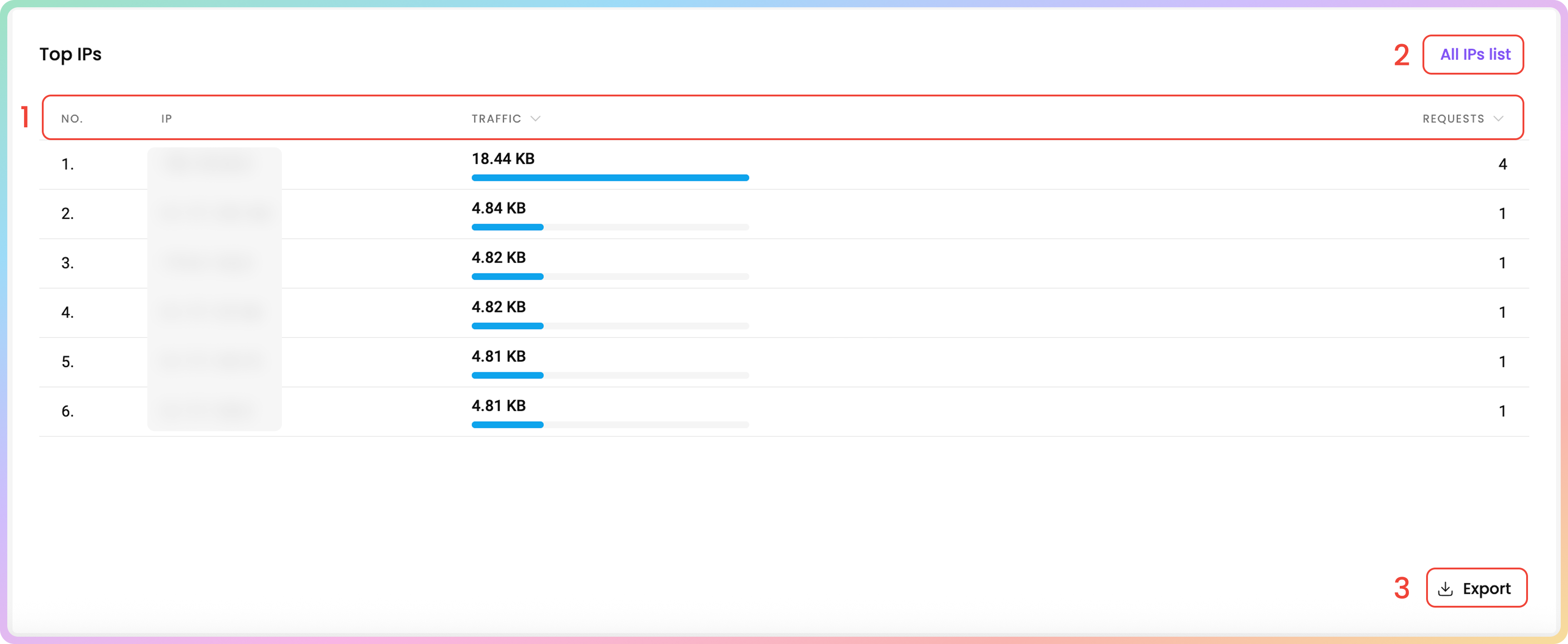 You can find the No., IP, Traffic and Requests columns.