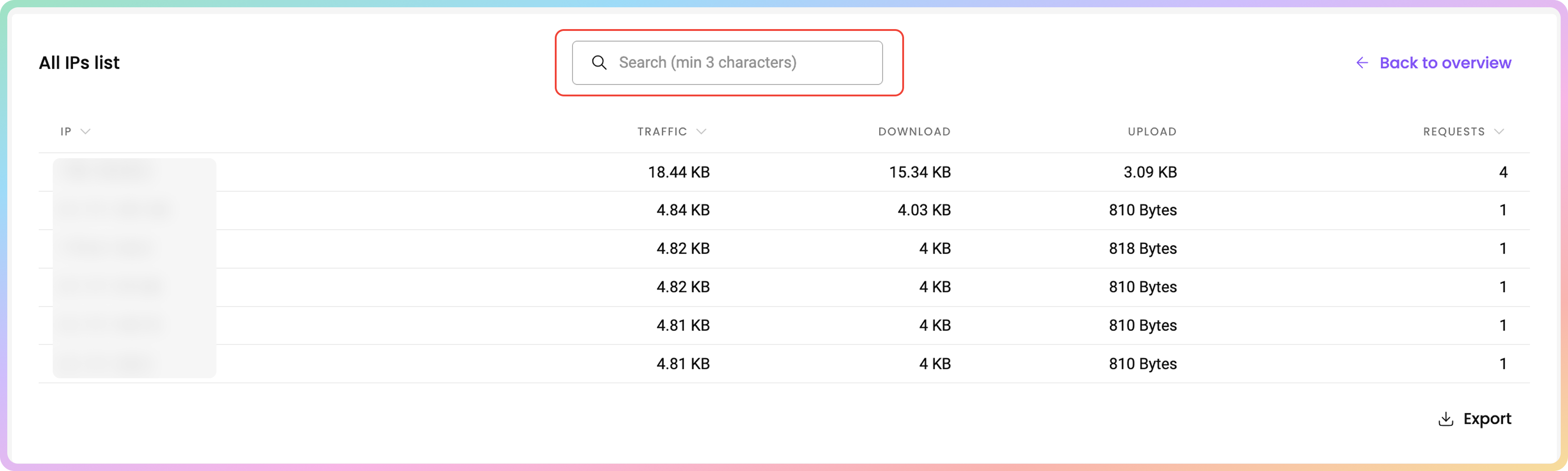 In the Top IPs table, you can see the proxy IPs you have targeted, sorted by total traffic consumption in descending order.