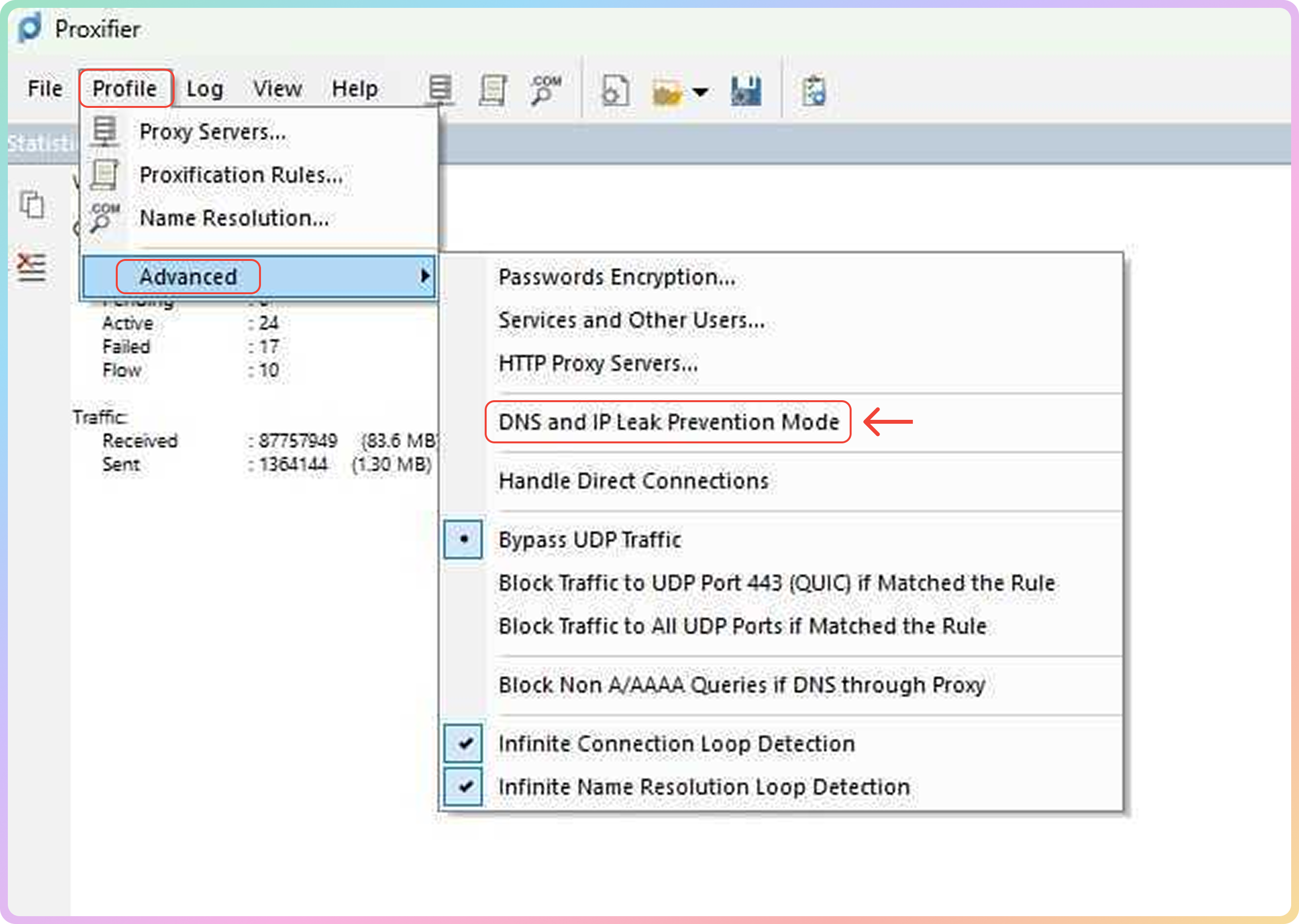 If you are having connection issues, here is a solution you can try on your end. Step 1. Click on Profile -> Advanced -> enable DNS and IP Leak prevention mode.