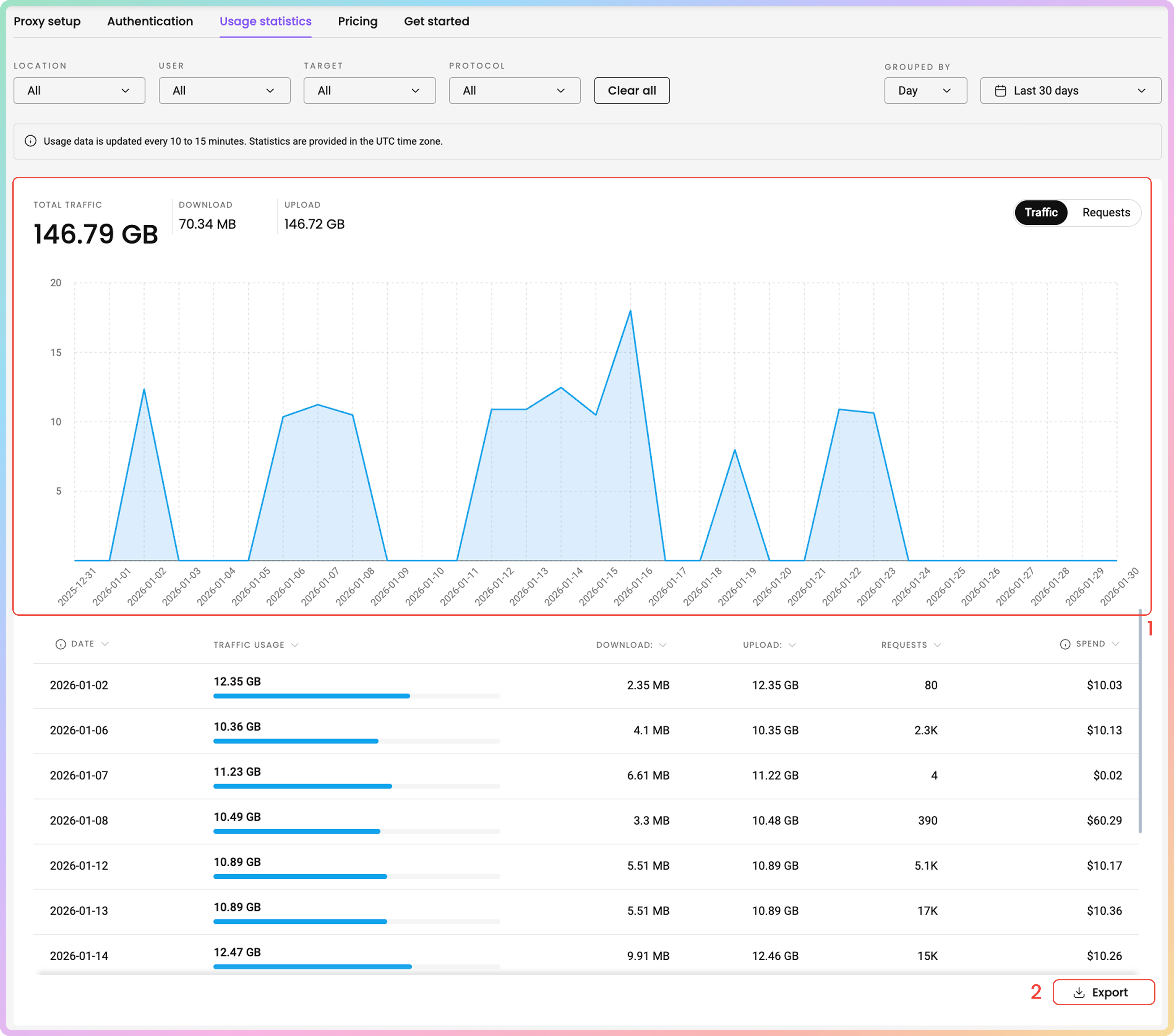 - Top Targets: Target, Traffic, Download, Upload, Requests, Spend (The total cost associated with the traffic).