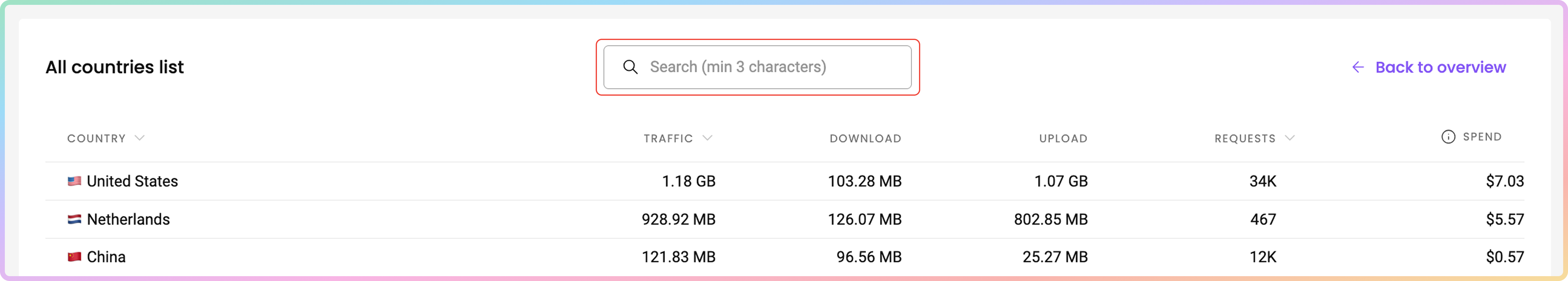 In the Top countries table, you can see the countries you have targeted with the proxies, sorted by total traffic consumption in descending order.