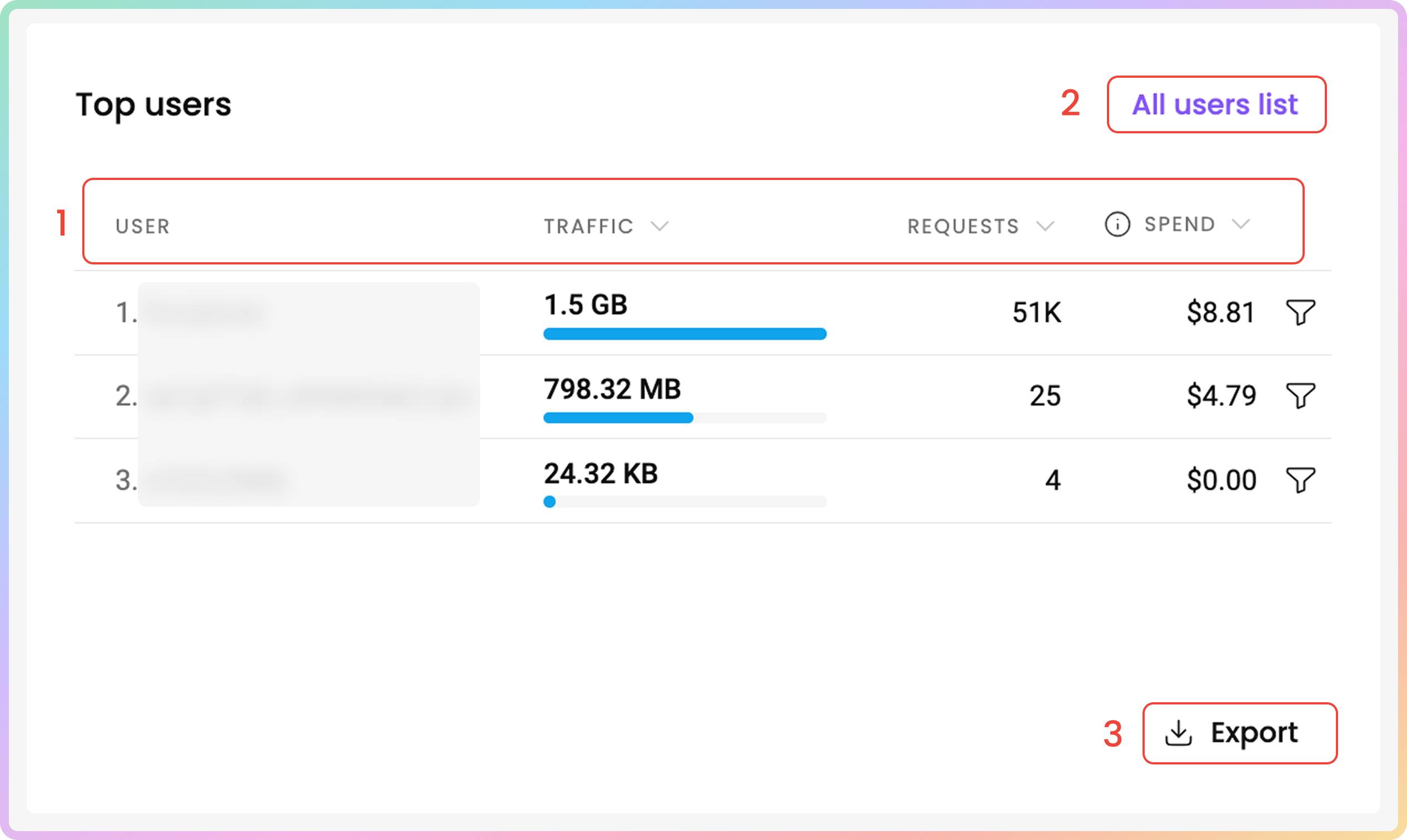 You can find the User, Traffic, Requests, and Spend columns as well.