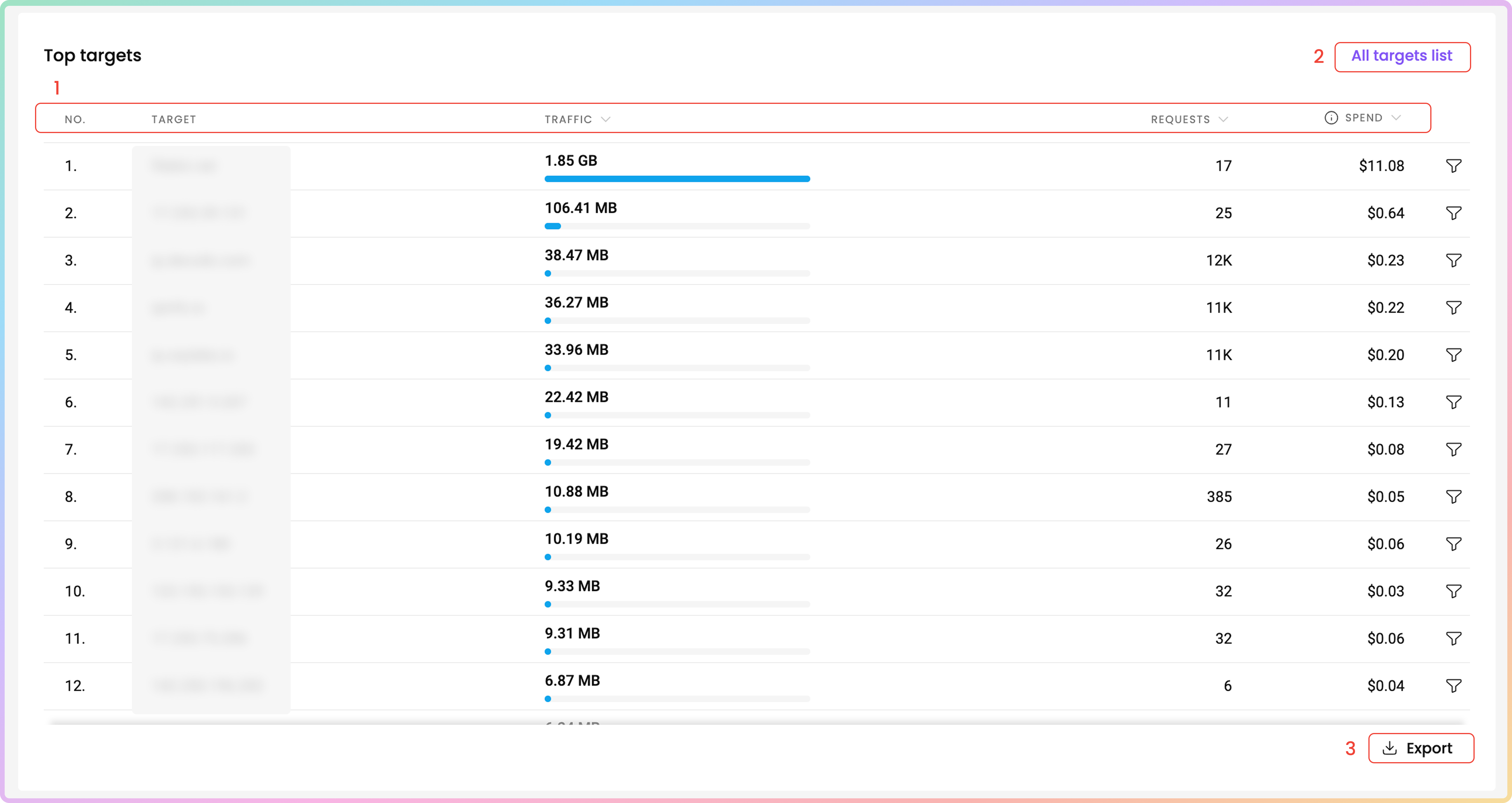 You can find the No., Target, Traffic, Requests, and Spend columns as well.