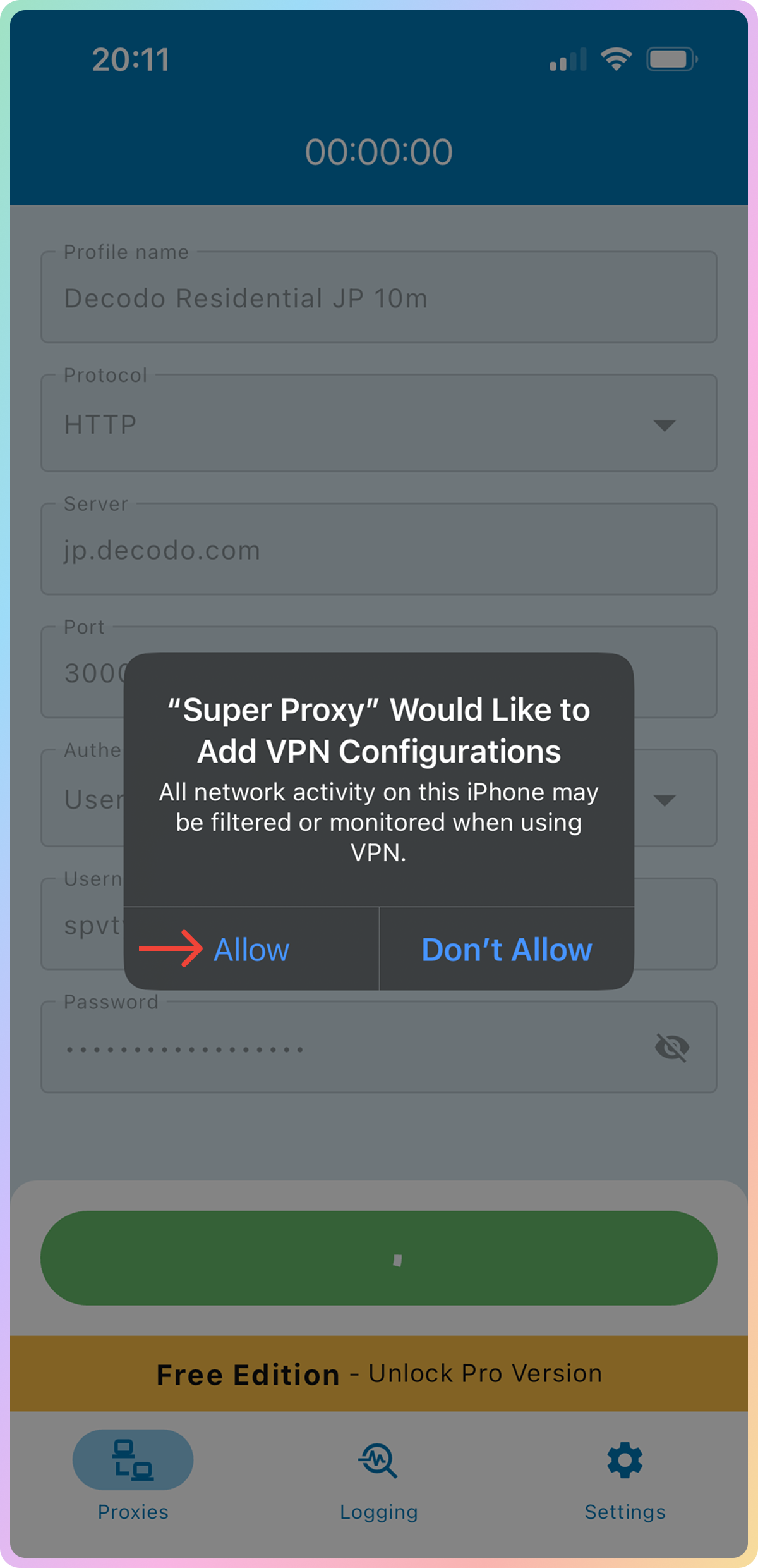 Step 7. A pop-up will appear, asking you to accept the VPN configuration. Tap Allow or OK, depending on your device.