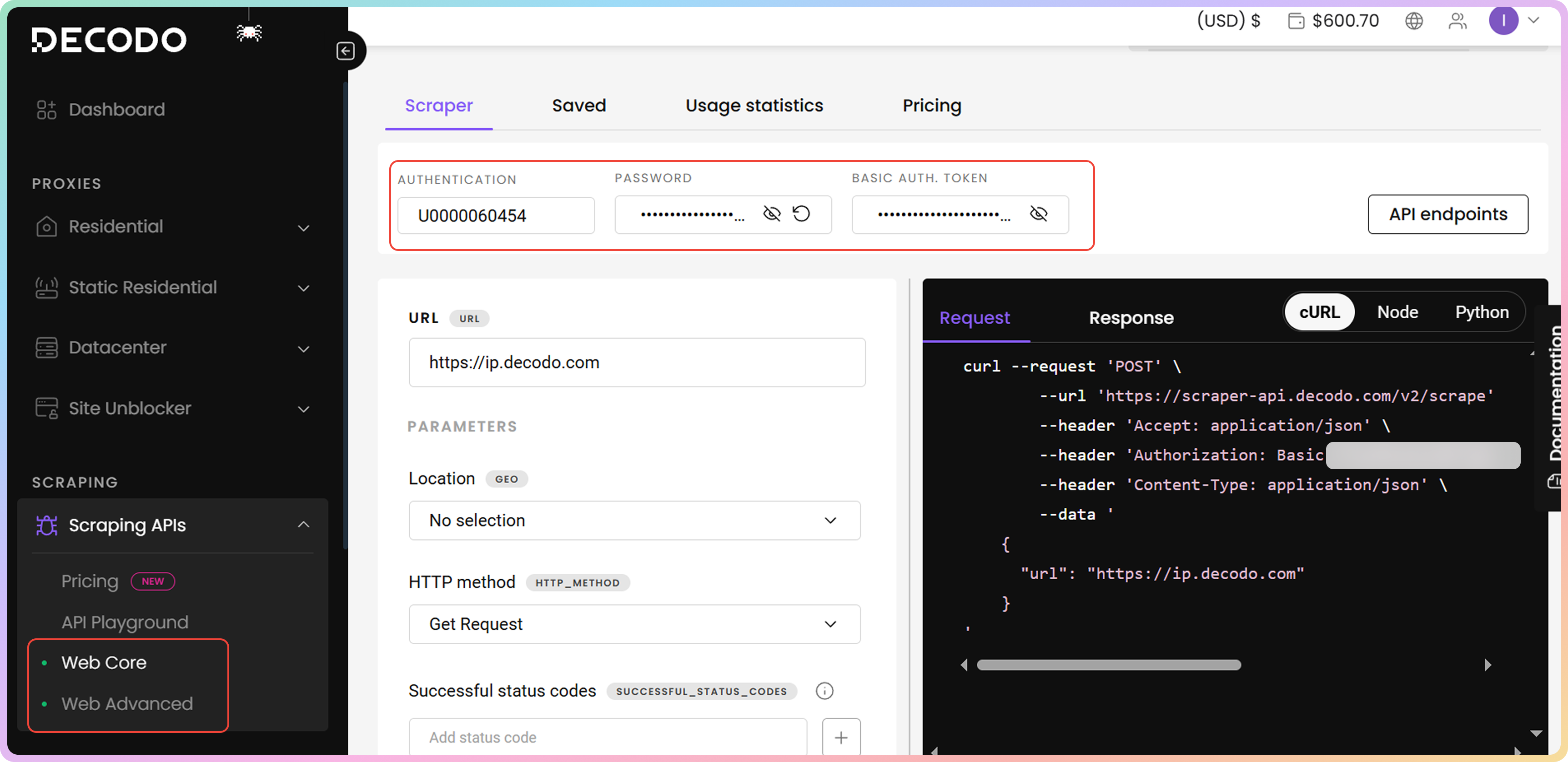 Once you have an active Web Core or Web Advanced subscription, you will be able to check your generated proxy Username, Basic Authentication Token, as well as see or regenerate a new Password in the Scraper tab.